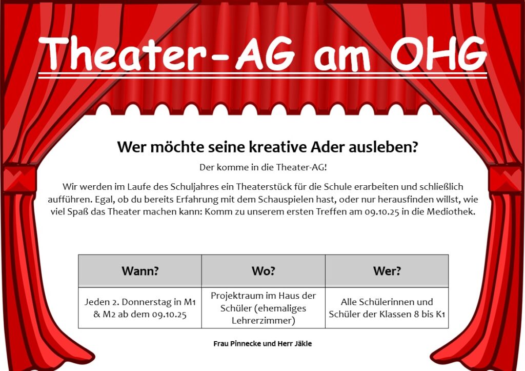 Die Theater-AG am OHG steht allen Schülerinnen und Schülern von Klasse 8 bis zur Kursstufe 1 offen und lebt von der Kultur der Beteiligung: Es gibt kein Casting, die Stücke werden in Zusammenarbeit mit den teilnehmenden Schülern besprochen und wurden in manchen Jahren sogar von Schülerinnen und Schülern verfasst. Zu Beginn eins neuen Schuljahres können Schülerinnen und Schüler neu beitreten.